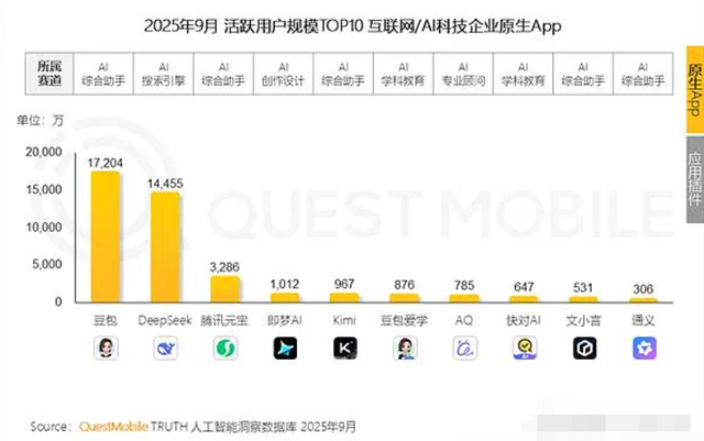 QuestMobile的数据显示,9月份腾讯元宝的月活为3286万,远不如豆包和Deepseek。