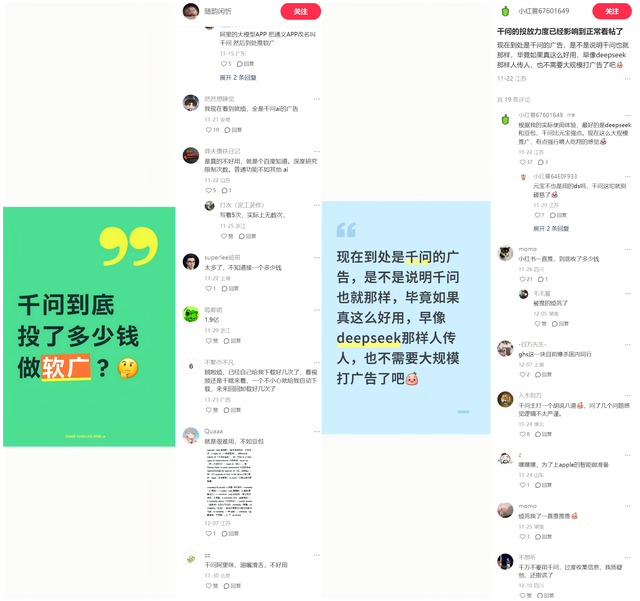 也有网友发出了质疑,现在到处是千问的广告,是不是说明千问也就那样,毕竟如果真这么好用,早像deepseek那样人传人,也不需要大规模打广告了吧。