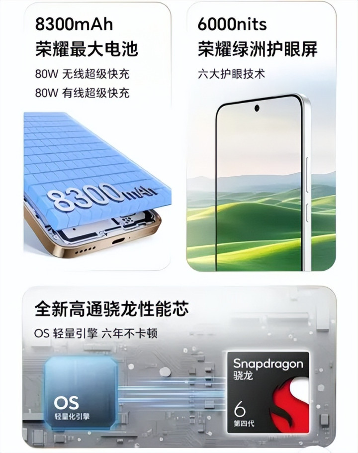 采用 6.79 英寸 1.5K 旗舰级屏幕,支持 120Hz 高刷,支持 3840Hz 超高频 PWM 调光,还有荣耀绿洲护眼技术,观感是国产手机顶级水平。