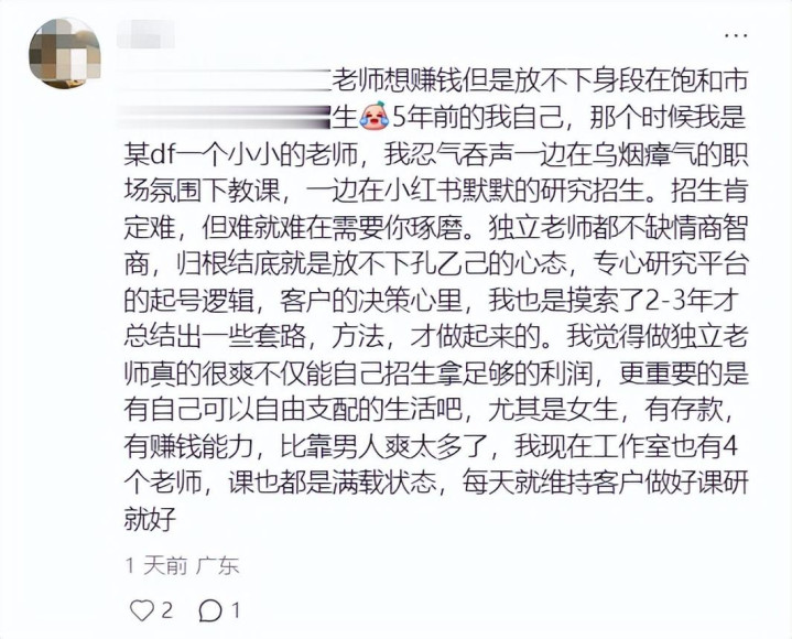 有网友表示确实如此,自己早年就是新东方的一线代课老师,收入不会很高,而且工作环境很压榨,于是自己便默默开始研究如何独立招生。