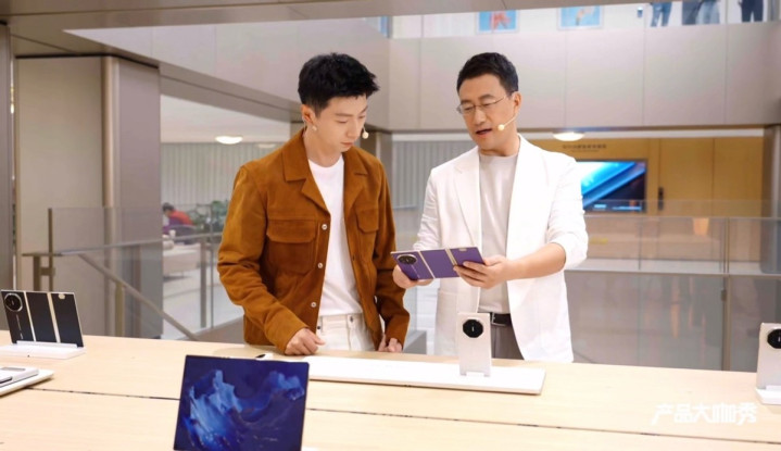 不仅如此,马龙还在何刚的陪同下参观了华为旗舰店,见证了多款耳目一新的产品,到达三折叠展区时,二人还对全新三折叠的配色展开讨论,马龙特别提到:“我是非常喜欢紫色的”,由此可见可见马龙对这款三折叠产品的喜爱程度,随后何刚介绍了:槿紫配色取意的就是紫气东来,这个设计非常这个大方。更真切感受到了华为旗舰店如“城市客厅”般的氛围,超大的公共休闲区域,每天都会提供的咖啡饮品,还有一对一贴心讲解服务,科技与生活仿佛在这里自然交融。