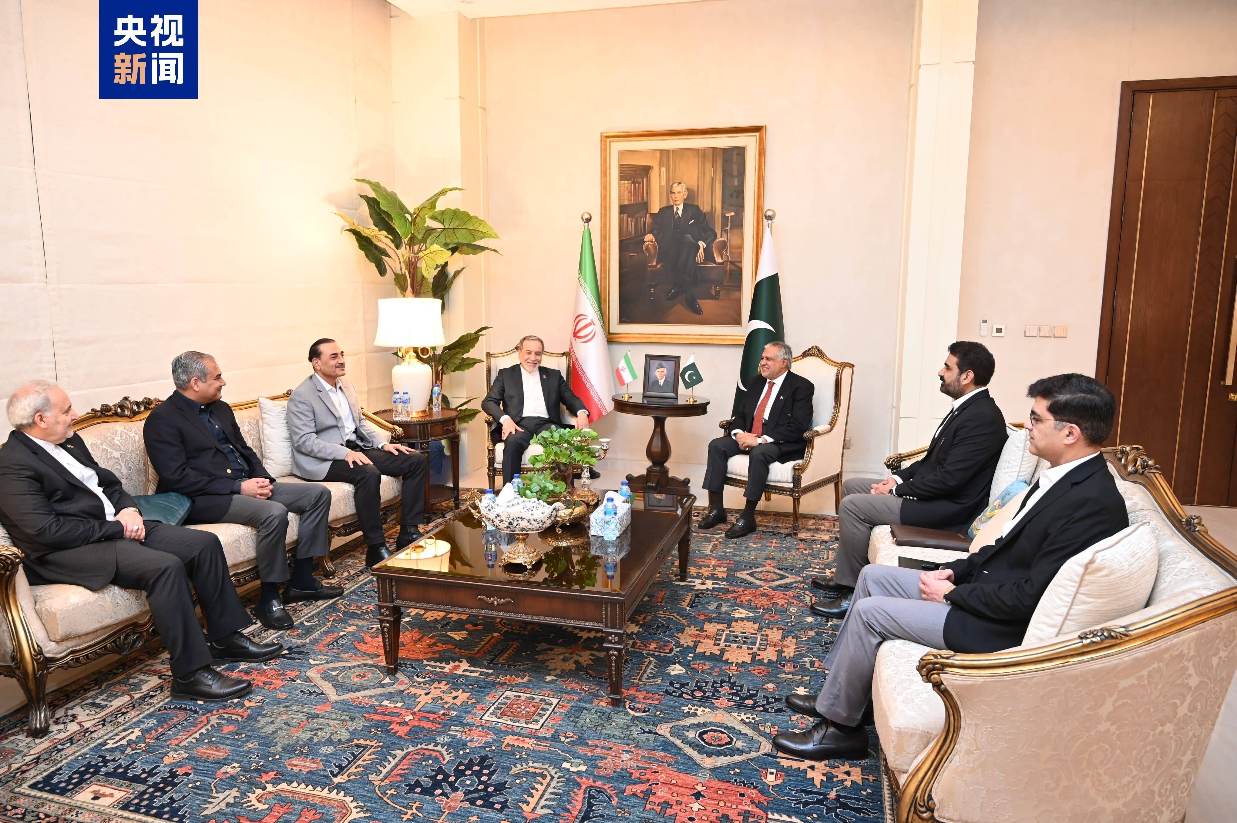 △当地时间4月24日,巴基斯坦,伊朗外长阿拉格齐(中左)在抵达巴基斯坦后与巴基斯坦副总理兼外长达尔会面